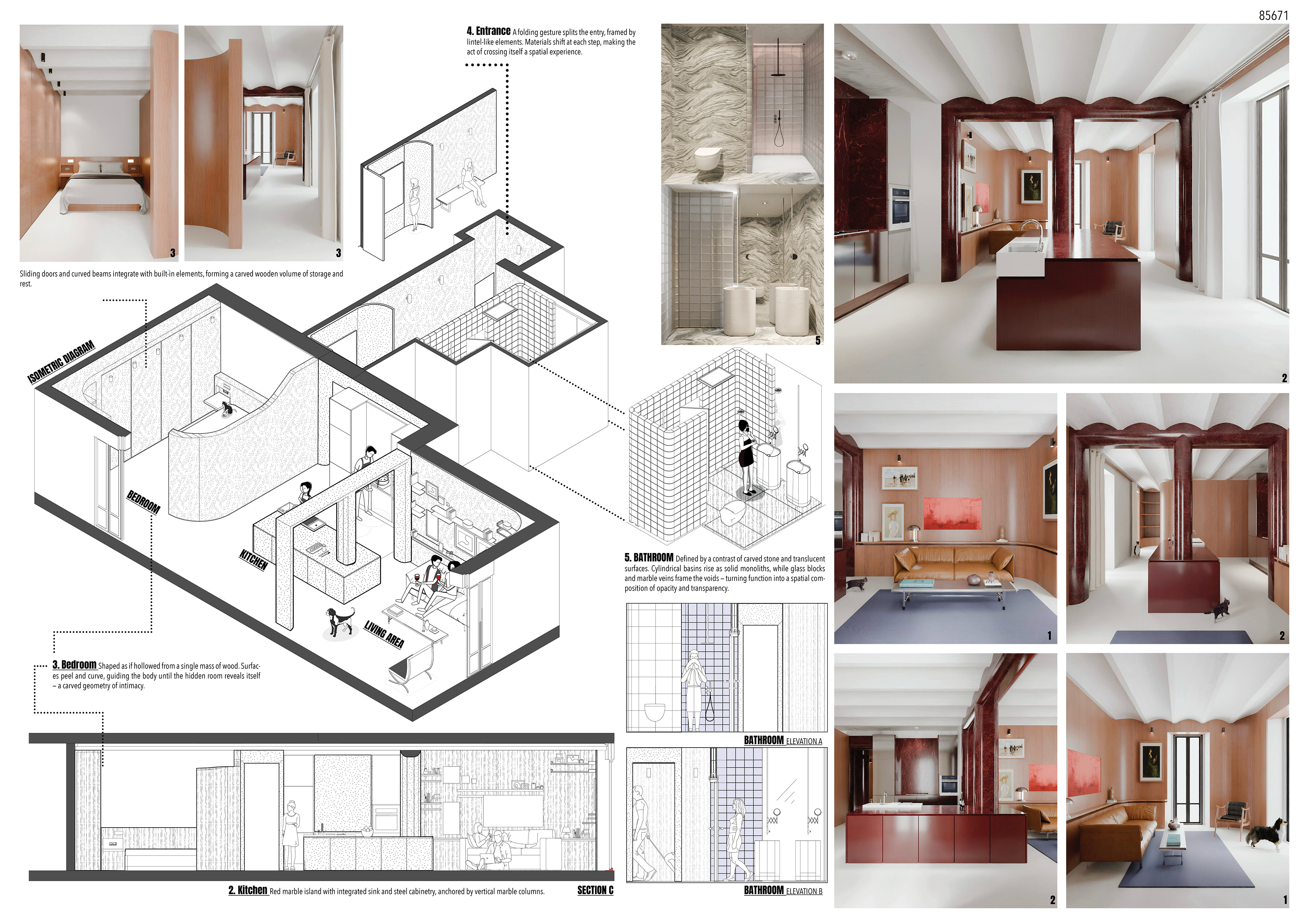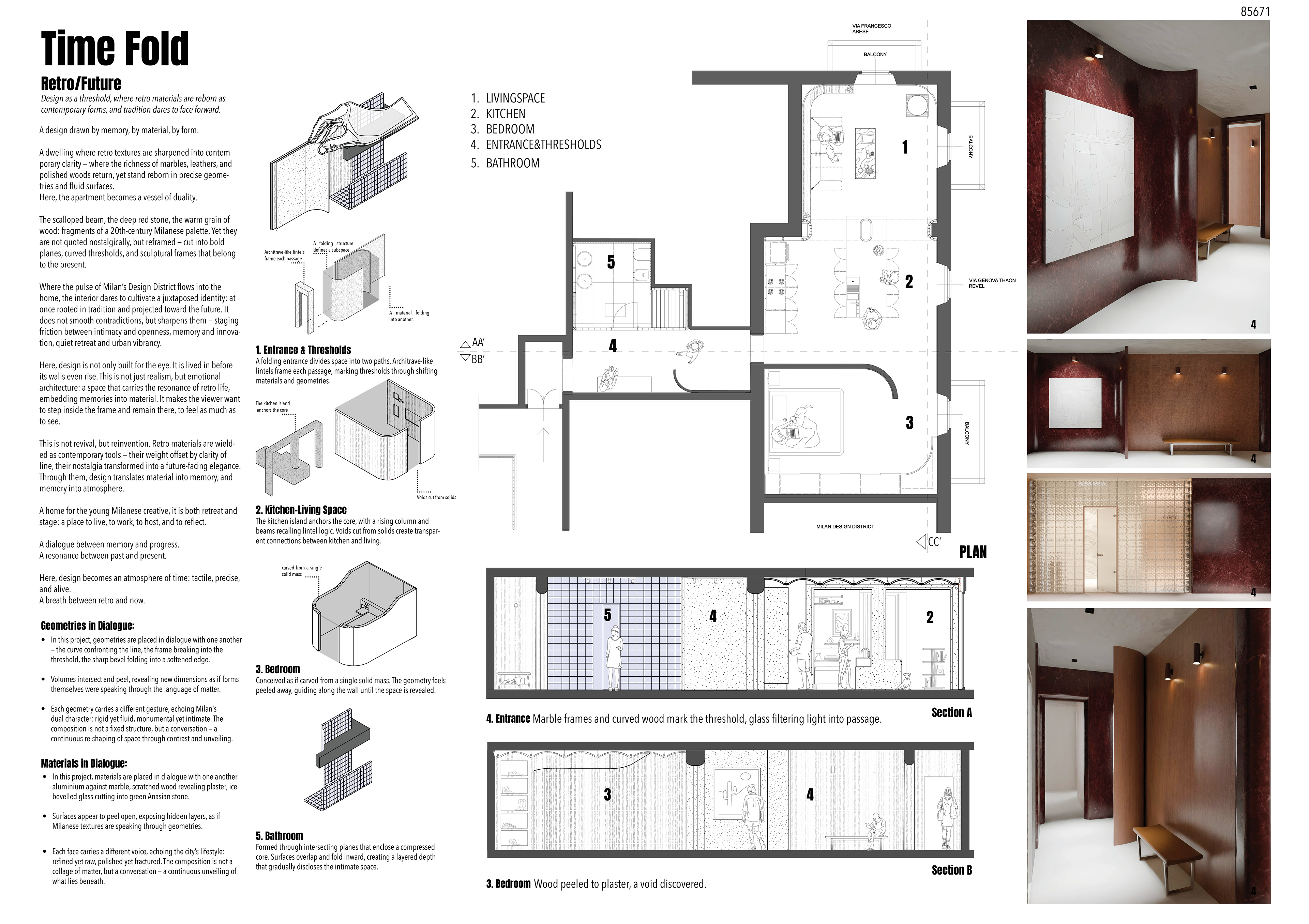 The project received both a Golden Mention and the Community’s Choice Award in the Milan Design Districtcompetition, which invited designers to reinterpret a traditional Casa di Ringhiera apartment in the Isola District. The design proposal explored how interior architecture can bridge Milan’s historical identity with contemporary modes of living, fostering a dialogue between memory, community, and material experimentation.