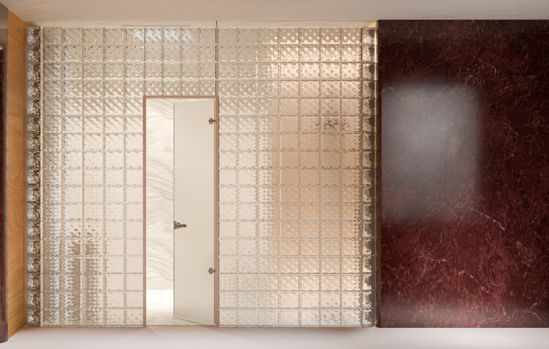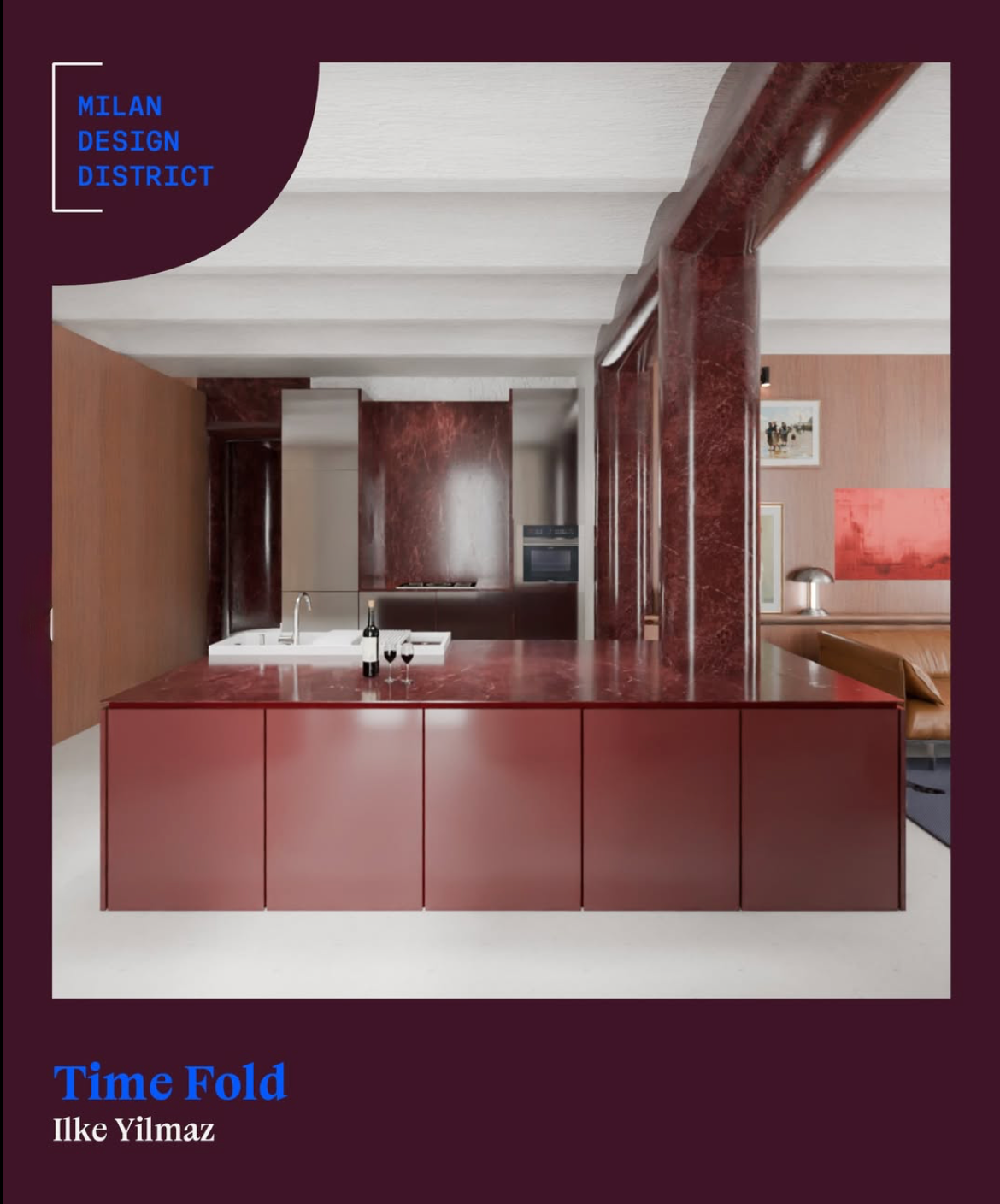 The scalloped beam, the deep red stone, the warm grain of wood: fragments of a 20th-century Milanese palette. Yet they are not quoted nostalgically, but reframed — cut into bold planes, curved thresholds, and sculptural frames that belong to the present.