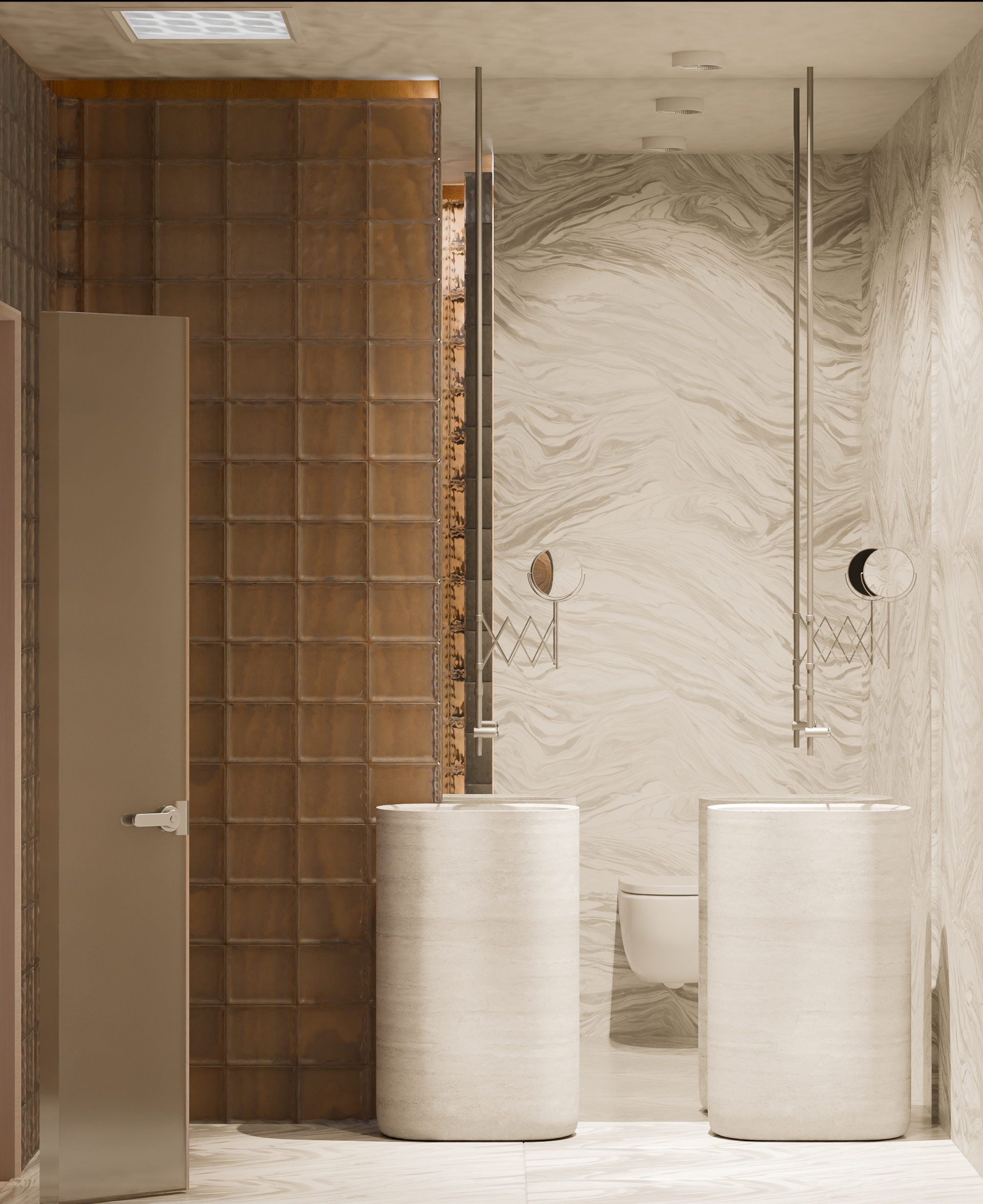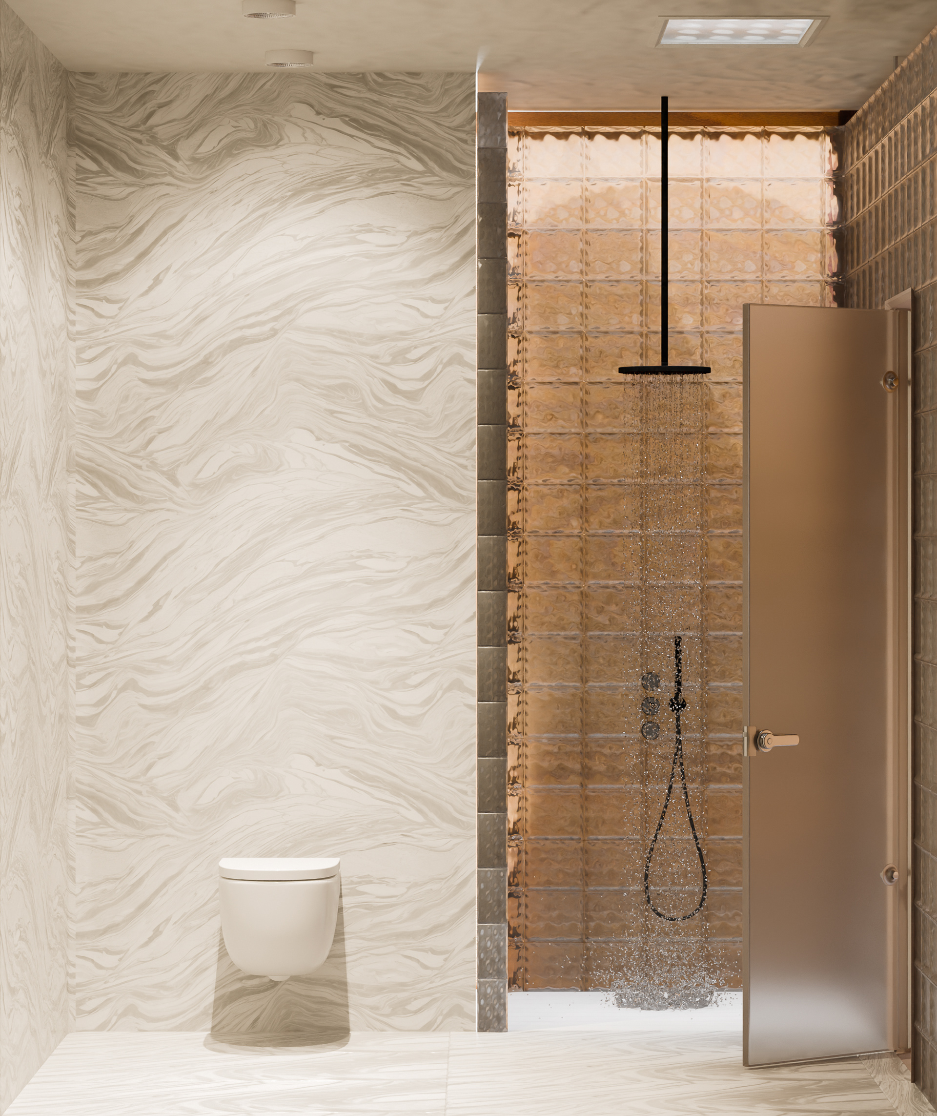 A dwelling where retro textures are sharpened into contemporary clarity — where the richness of marbles, leathers, and polished woods return, yet stand reborn in precise geometries and fluid surfaces.